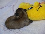 Kukyno už je kus čivavy, která má plno elánu do života. Maminu nenechá jen tak na pokoji a jak může, masíruje ji bříško. Také je již vidět, že bude dlouhosrstý, již má krásnou, huňatou, měkoučkou srst. Modrá, kterou měl na ouškách a v melírku za poslední týden stmavla, přímo zčernala. Bude tedy plaváček s černou maskou a melírkem.